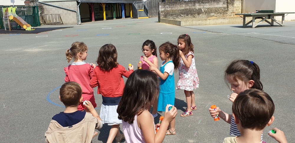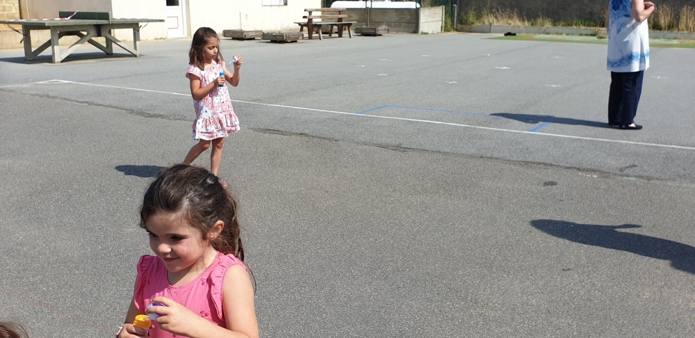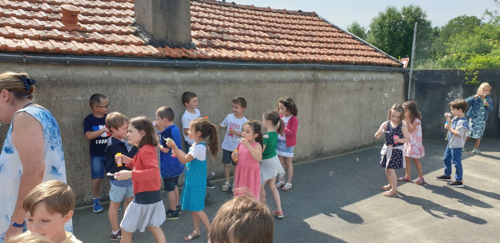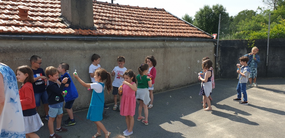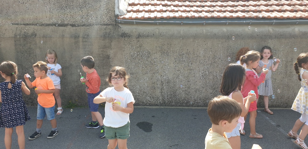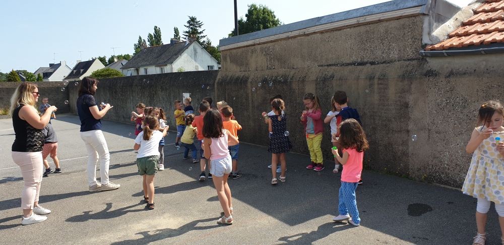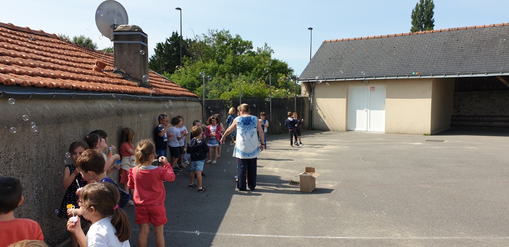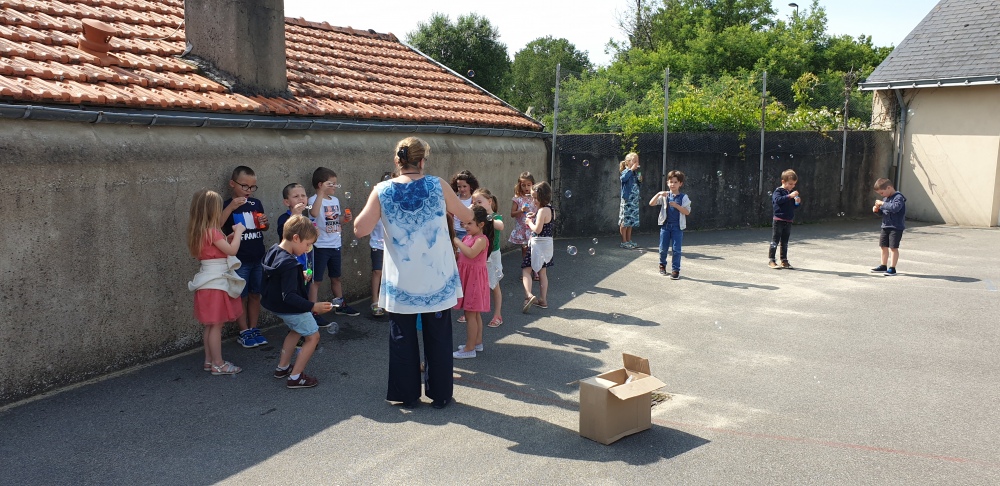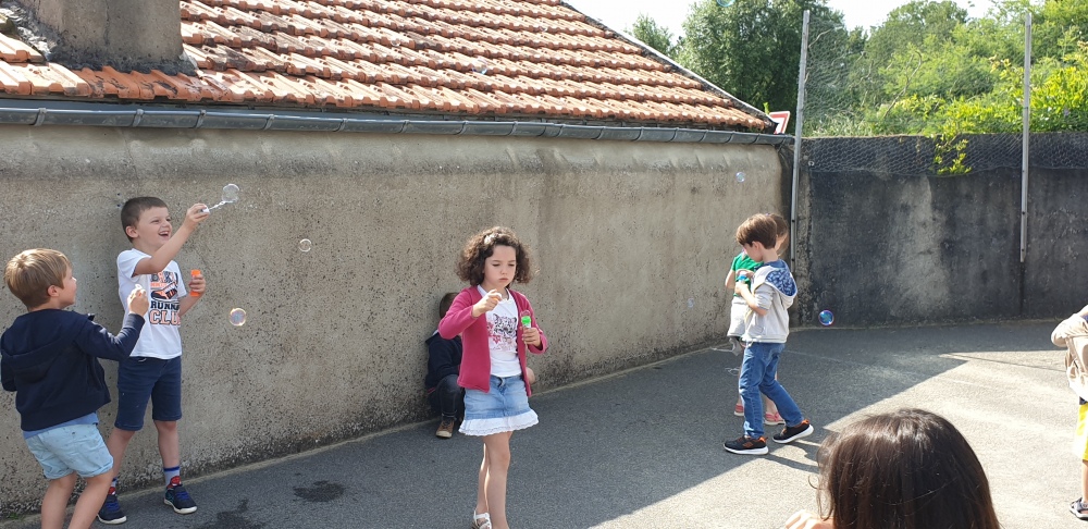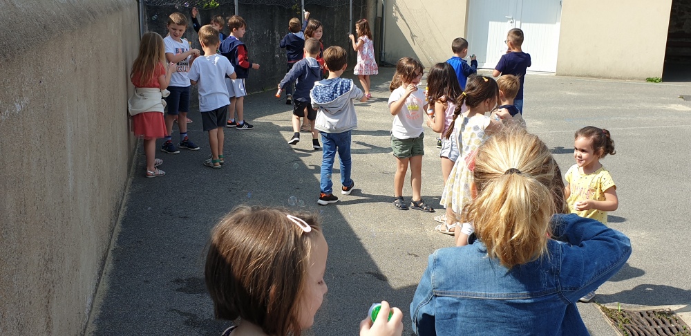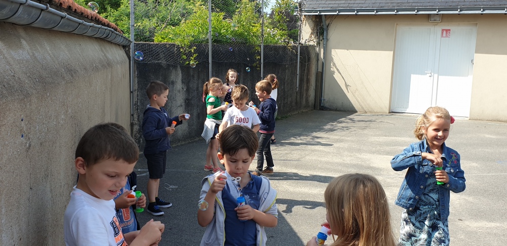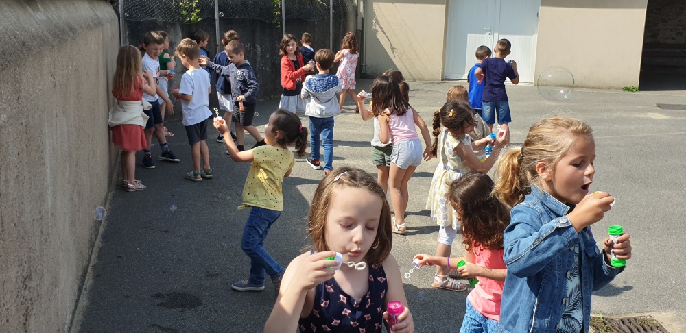 Mais grâce à l’aide de l’APEL, Roseline, Florence, Mélanie et Karine nous ont réservé une belle surprise! Nous avons chacun eu un appareil à bulles et nous avons pu ainsi nous exercer à bien souffler pour faire s’envoyer des milliers de bulles dans le ciel de Crossac!