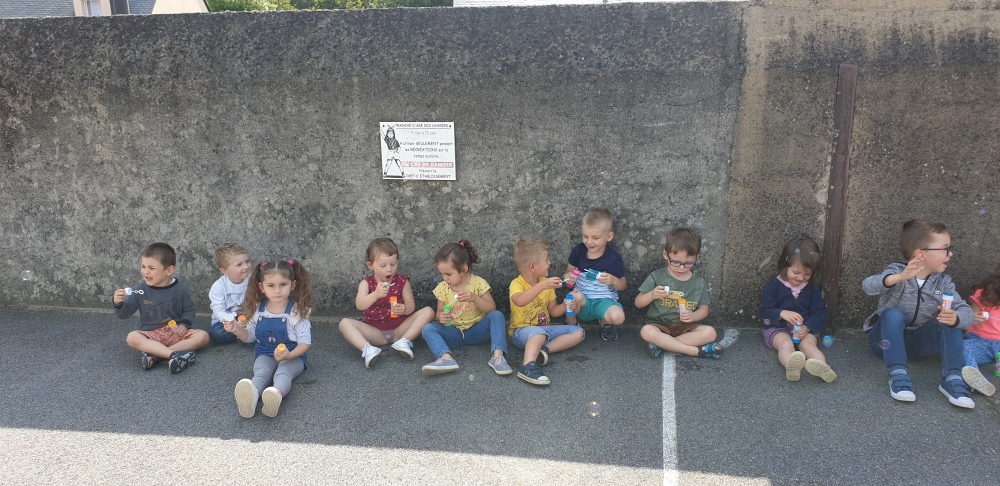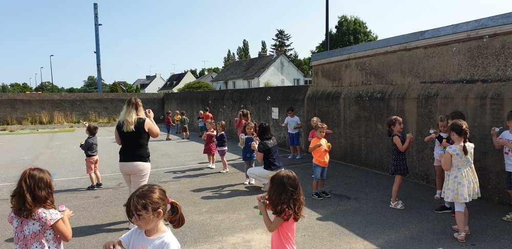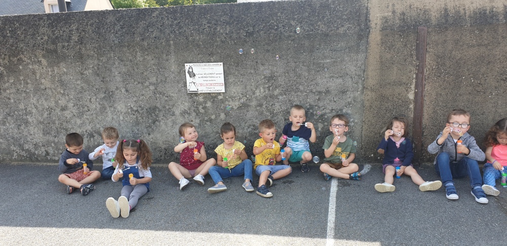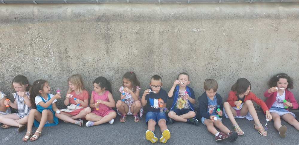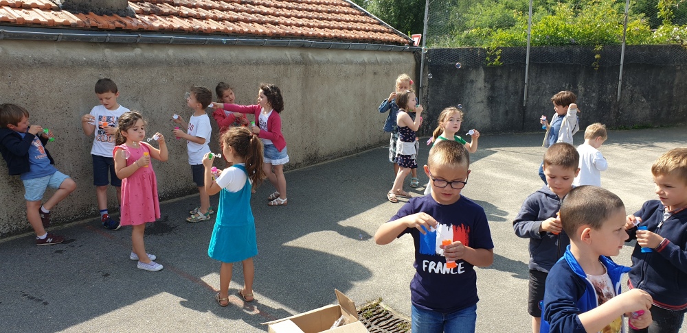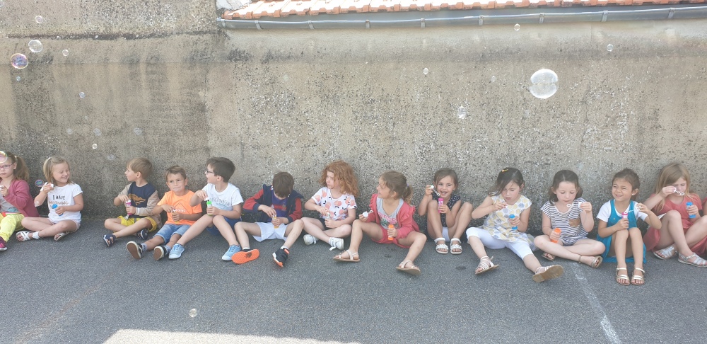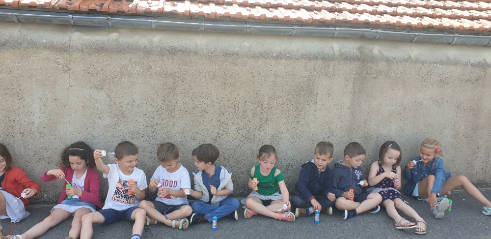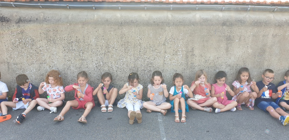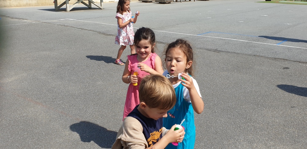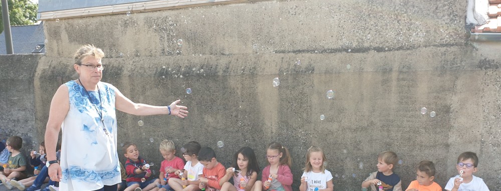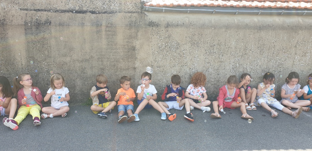 Mais grâce à l’aide de l’APEL, Roseline, Florence, Mélanie et Karine nous ont réservé une belle surprise! Nous avons chacun eu un appareil à bulles et nous avons pu ainsi nous exercer à bien souffler pour faire s’envoyer des milliers de bulles dans le ciel de Crossac!