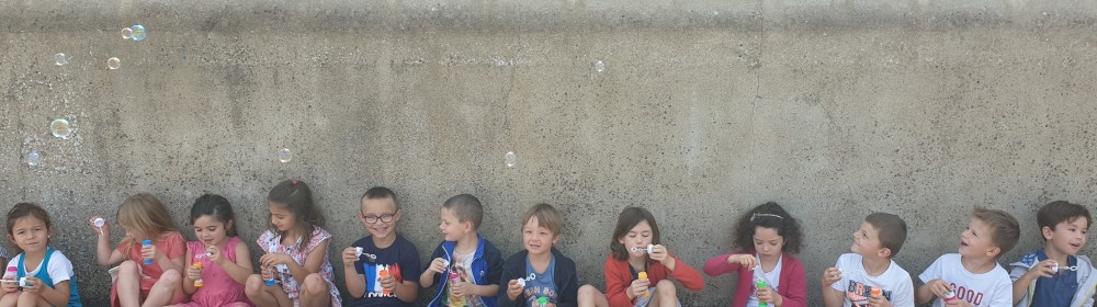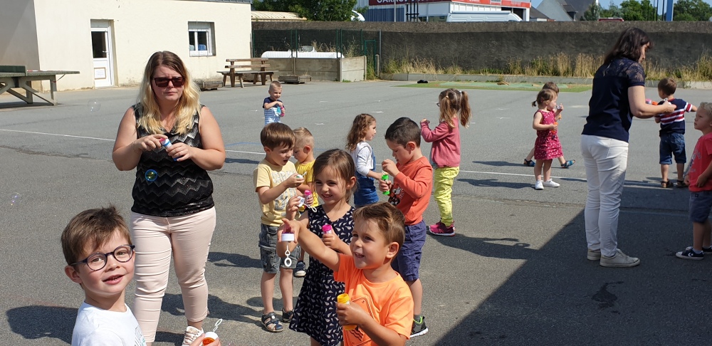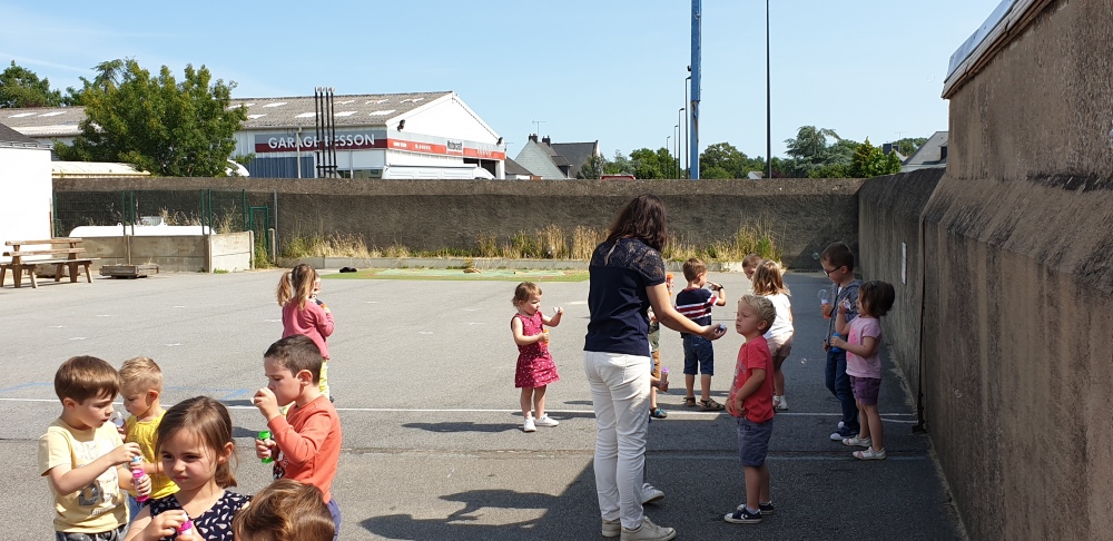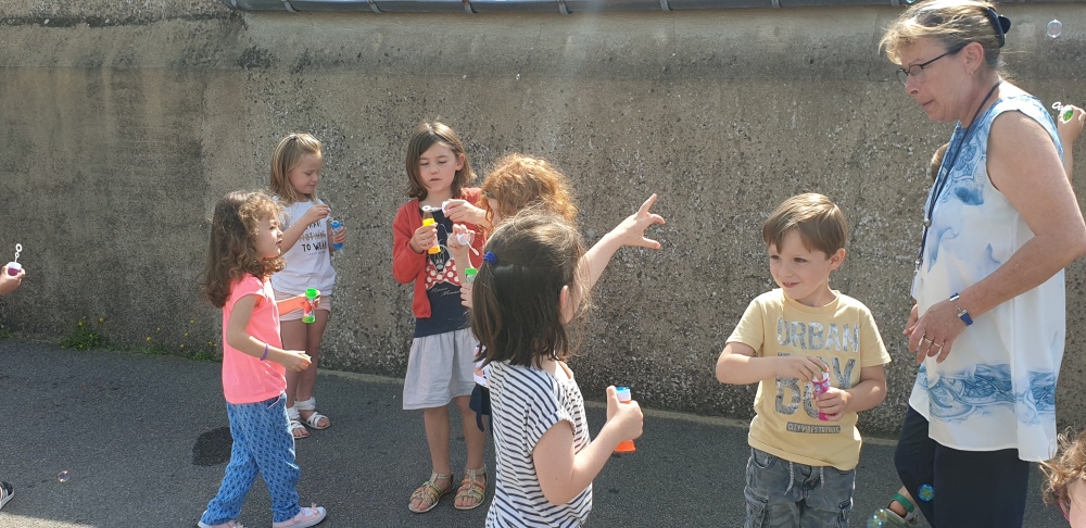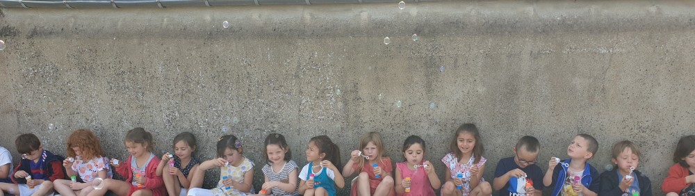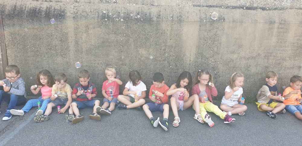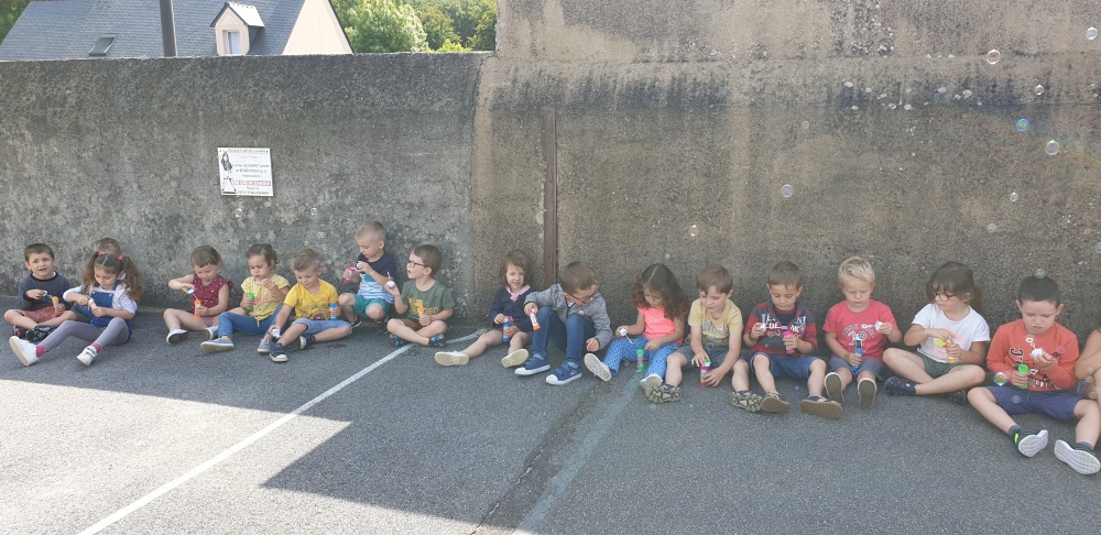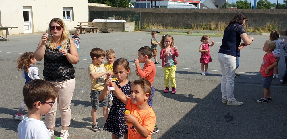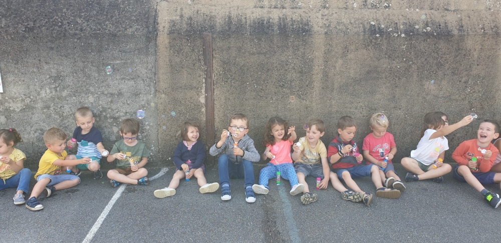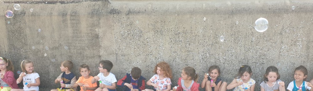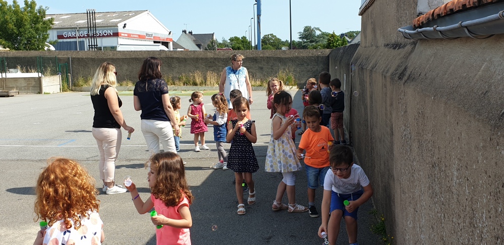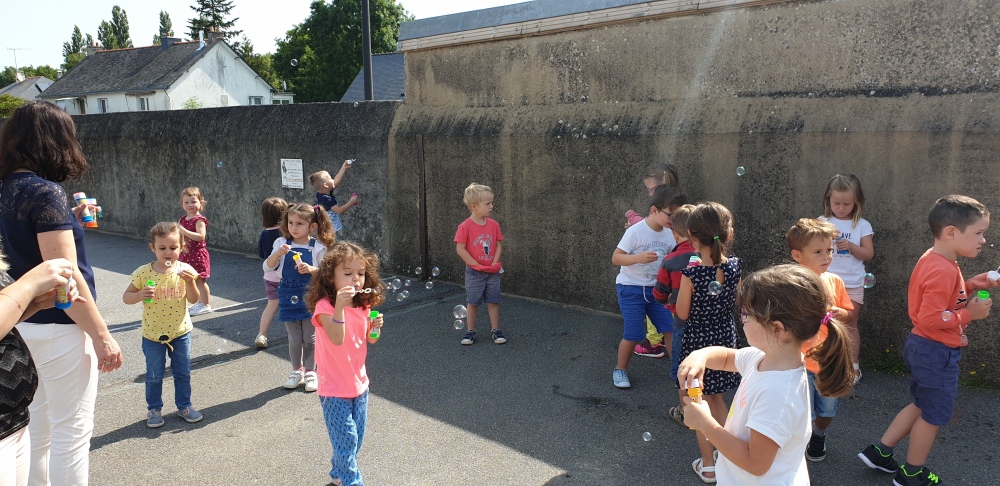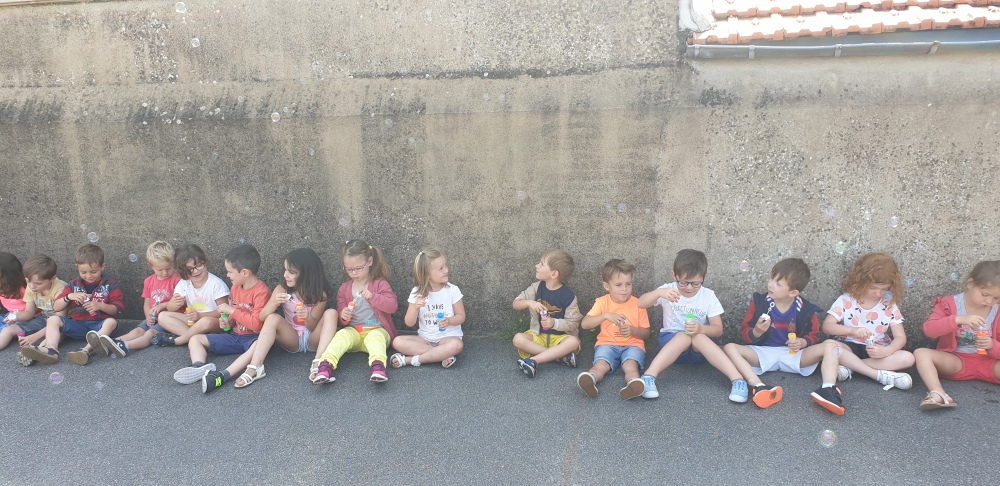 Mais grâce à l’aide de l’APEL, Roseline, Florence, Mélanie et Karine nous ont réservé une belle surprise! Nous avons chacun eu un appareil à bulles et nous avons pu ainsi nous exercer à bien souffler pour faire s’envoyer des milliers de bulles dans le ciel de Crossac!