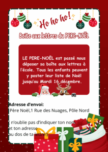 Le Père-noël a déposé sa boîte aux lettres à l’école. A partir du lundi 1er décembre, tous les enfants peuvent poster leur lettre au Père-Noël sur la cour de l’école. La boîte se trouve à côté de la porte de la Véranda des MS-GS.