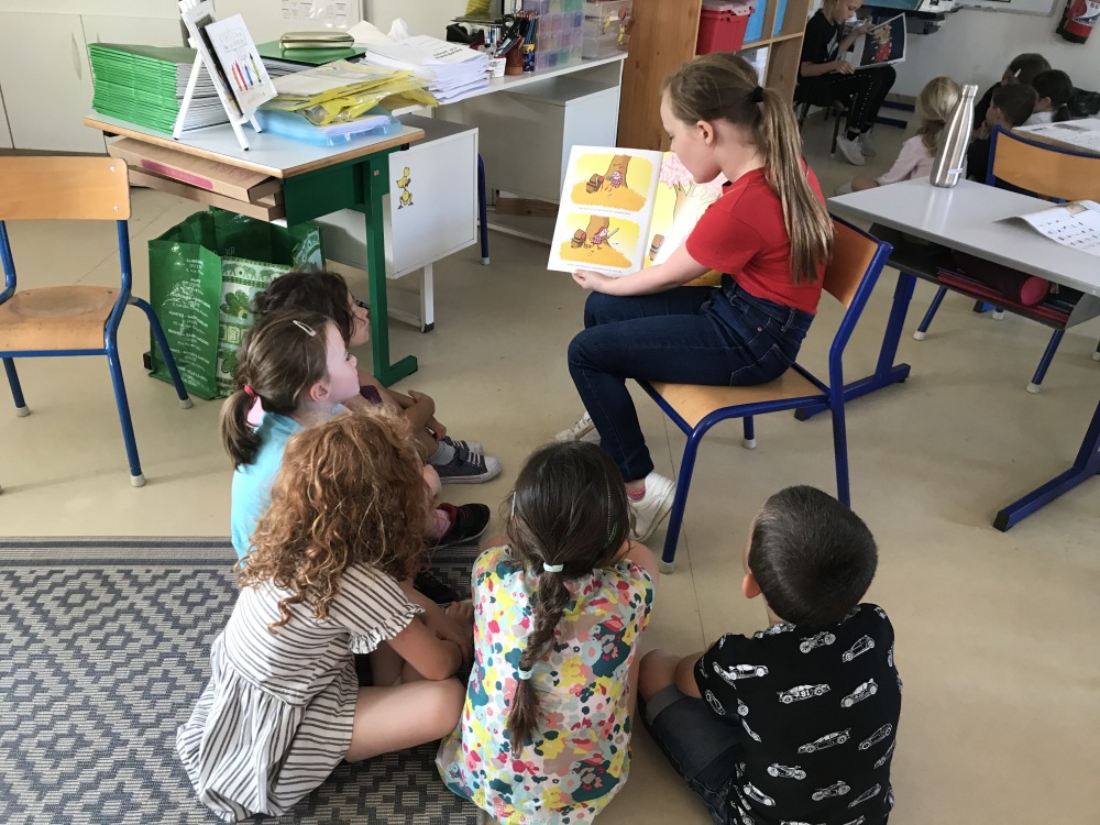 Tous les lundis après la récréation, quatre élèves de CM de la classe de Tiphaine et de Marion venaient lire aux élèves de CP des albums sélectionnés par Sophie . Les enfants étaient enchanté d’entendre les CM lire et Sophie aussi enchantée d’entendre certains anciens petits CP devenus de Grands lecteurs ! Depuis le nouveau protocole , nous sommes privés de ces échanges et nous le regrettons . Tiphaine et sa classe profitaient de ce quart d’heure de lecture pour feuilleter et lire personnellement romans ou albums .