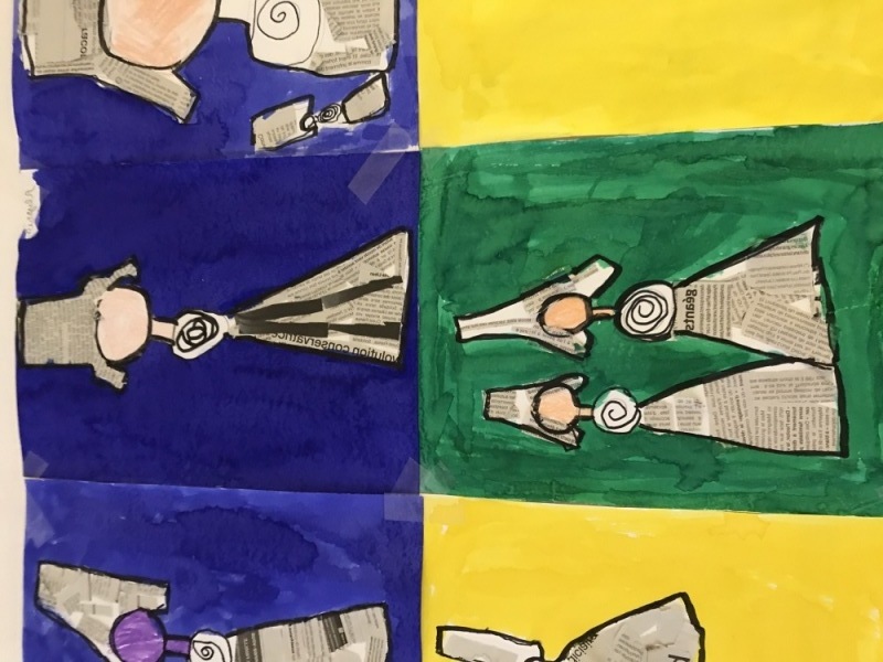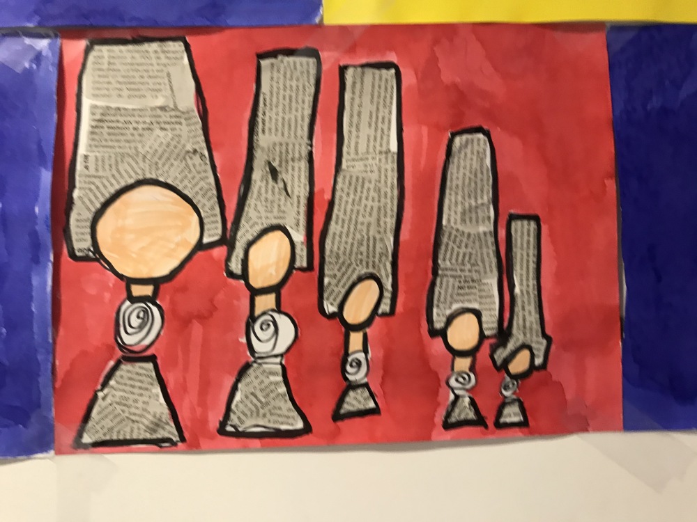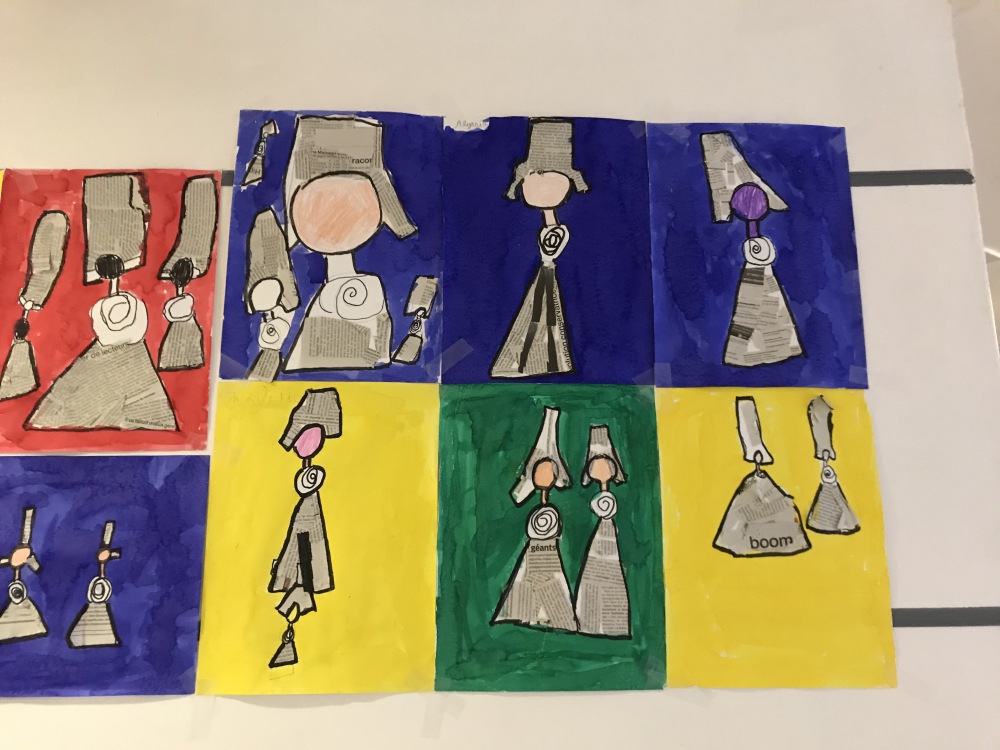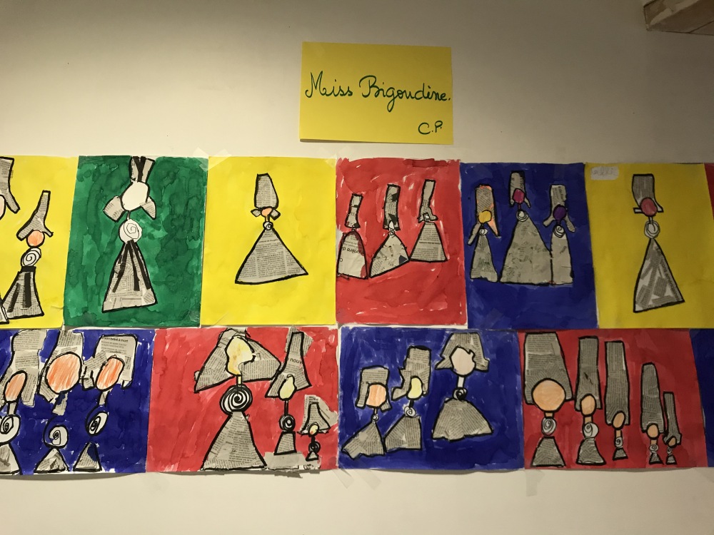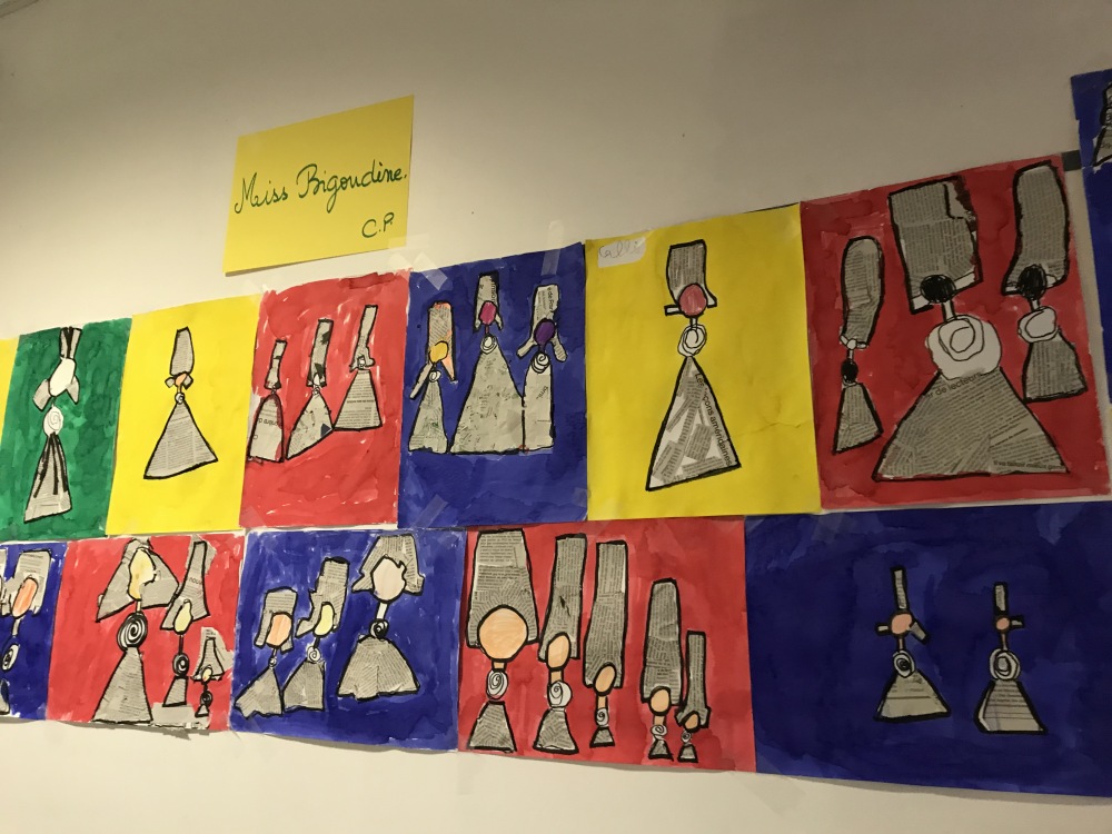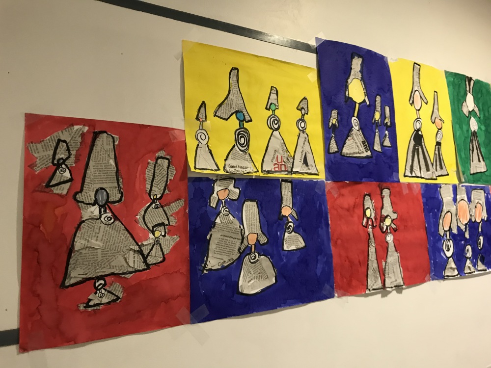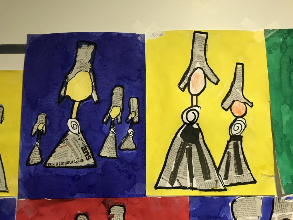 En Art visuel, nous avons réalisé nos Miss Bigoudène en utilisant le papier journal comme « tissu » et de l’encre pour les mettre en valeur !